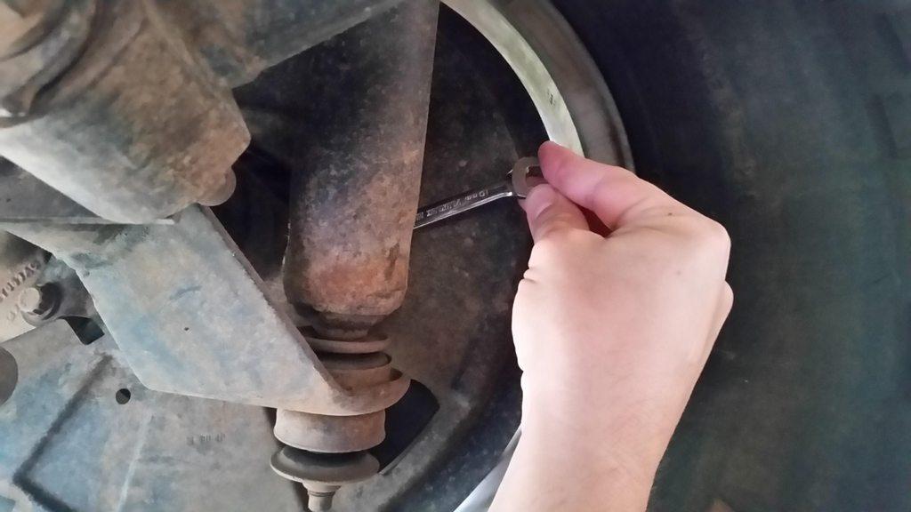 Crack the wheel nuts (27mm / or 1-1/16 for you imperial types), and jack the vehicle. Use axle stands. Or if you are expecially hardcore, don't.