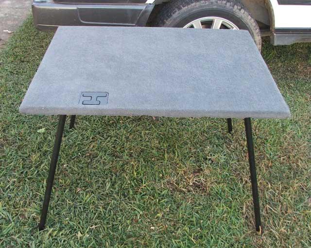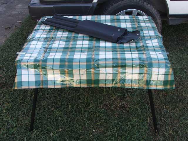 The table cloth is plastic coated. Note the clips at each corner to hold it on in a wind. The bag holds each leg in its own pocket to stop rattles. The tablecloth folds into the other pocket.