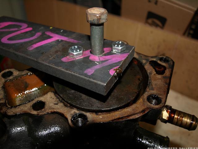 Made up a crude puller to remove the impeller from a bit of 10mm flat steel, some 8mm HT bolts (thread is 8x1.25 from memory), and a 12mm bolt and nut.