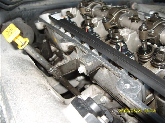 Disconnect the 5 injector top plugs - squeeze the wire bar inwards and the plug will lift off.