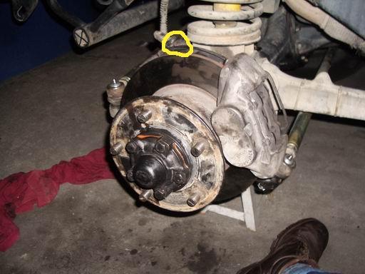 First things first - remove the clip that holds the brake pipe to the bracket on top of the swivel. Then you can wriggle the end of the brake pipe out a little so when you remove the caliper, you can twist it out of the way without bending the metal pipes, and not too much stress on the flexible one