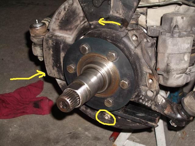 The little bolt at the bottom, followed by the nut behind the steering stop bolt. You don't have to turn that stop bolt, but it's an idea to hold it whilst you undo the nut. The bolt is threaded into the swivel casting, and the nut at the other end only holds the shield on. Then slide the shield off towards the front of the car. If you undo the bracket on top, it lets air into the swivel, and whatever oil may leak out. If you have provision for a drain on the swivel, use it now.