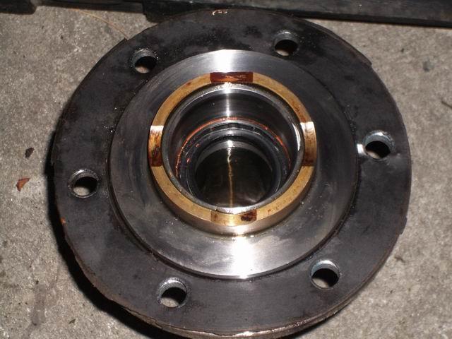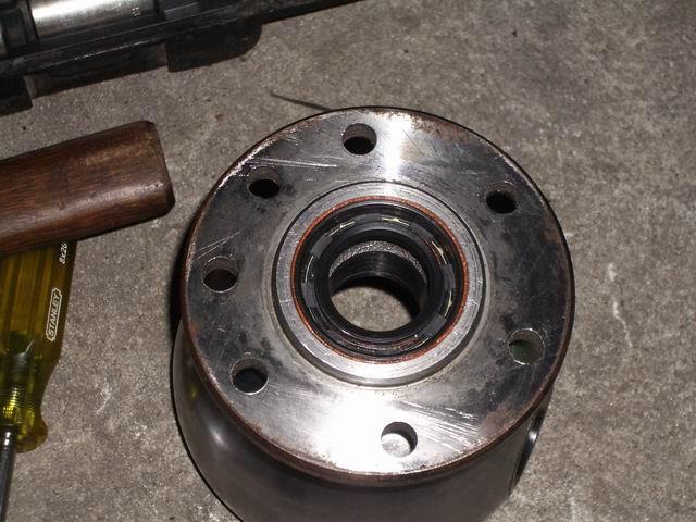 This is the reverse of the stub axle assembly. I've already removed the old seal and the axle bearing. It's a roller bearing type encased in a sturdy race.When I removed the seal, I found that provided I used a medium screwdriver, I could tap the bearing out using the old seal as a drift, and that way there was no damage to the bearing. Putting the new seal in was no problem, just gentle taps with screwdriver to seat it at the bottom. There is a ridge just above it, so you can tell if it's sitting square or not. I used the old seal as a drift to protect the bearing on reassembly, as it is a bit tight going back in. Fortunatly I didn't bend anything and it went in ok.