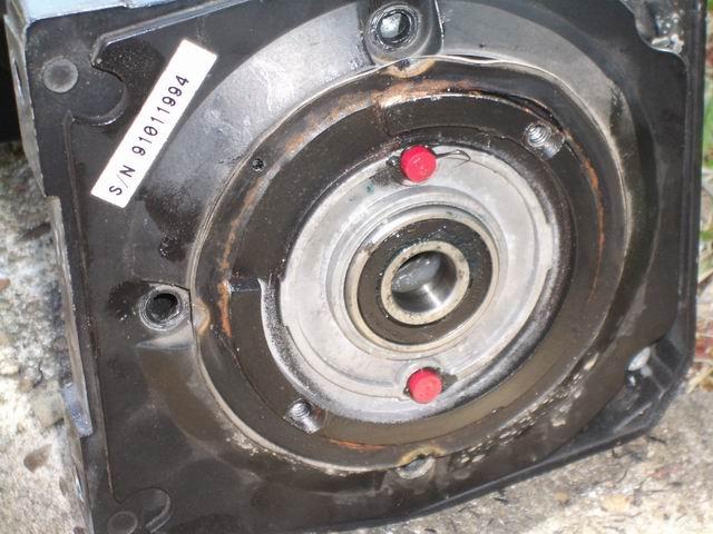 This is first thing you see after removing the motor. A combination end plate/ bearing support. And yes, it is a 6203 bearing in there. That one had a little binding, so I replaced it. Just sits there, held by a collar against the shaft.