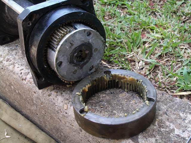 Business end: On a x9, a spring loaded 10mm pin slots into one of those three indents on the gear that is lying on the concrete. Warn do this differently. The transmission shaft you can just see in the middle of the planetary gear set. If you have ever taken a drill apart, this is the same, only bigger. The grease appears to be grade 3 or better, very waxy.
