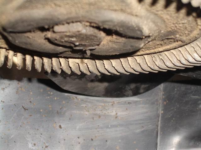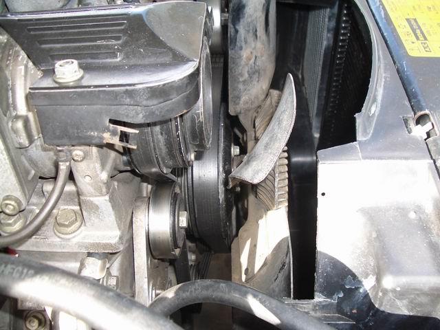 But...although it clears the sides and top and pulleys OK, the metal and untrimmed plastic Ford fans scape along the bottom of the shroud. Look at the bottom of the pic below: