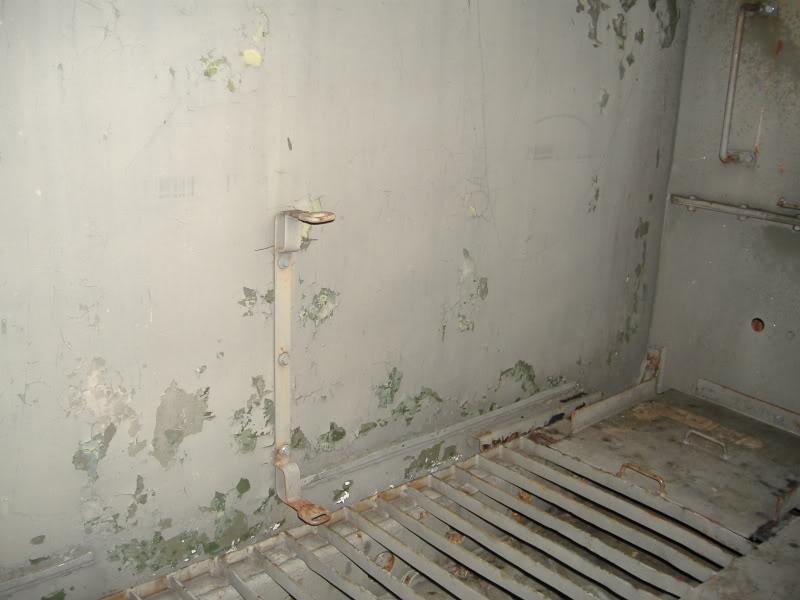 Bracket on rear tail gate (ladder) and note radiator, hull outlet in floor and the plate and loops for straps to hold two water jerry cans.