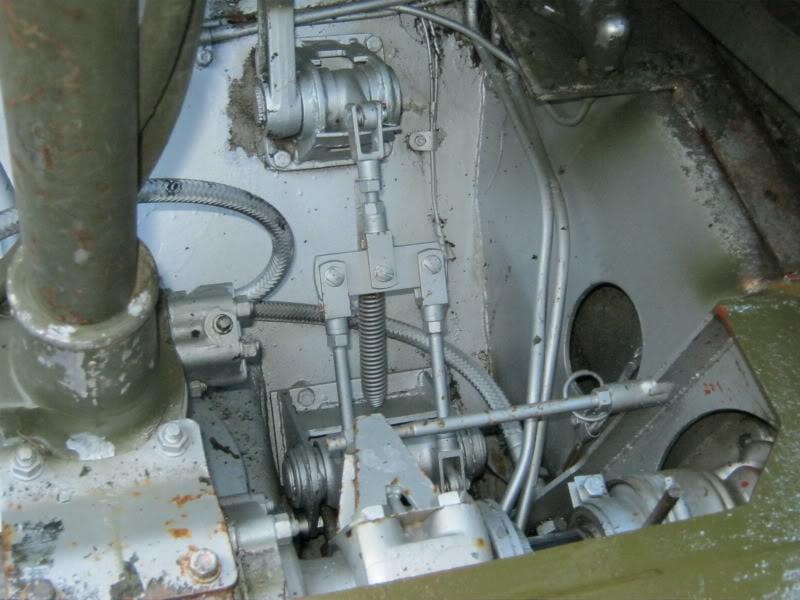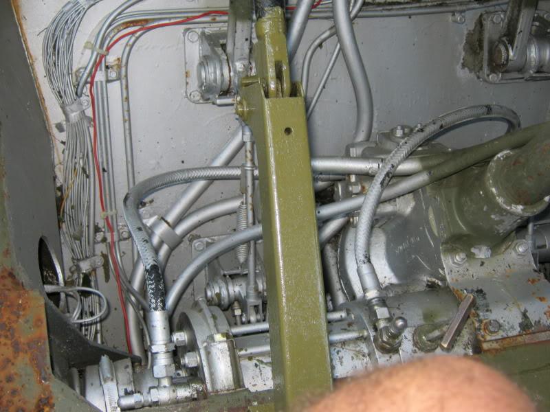 This is the extreme LHS of the hull showing the clutch pedal pivot , steering cylinder with T shaped oil filler handle.