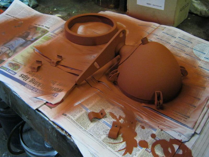 With the lights and guards off in was a good time to needle gun the area behind the lights and paint for refitting.