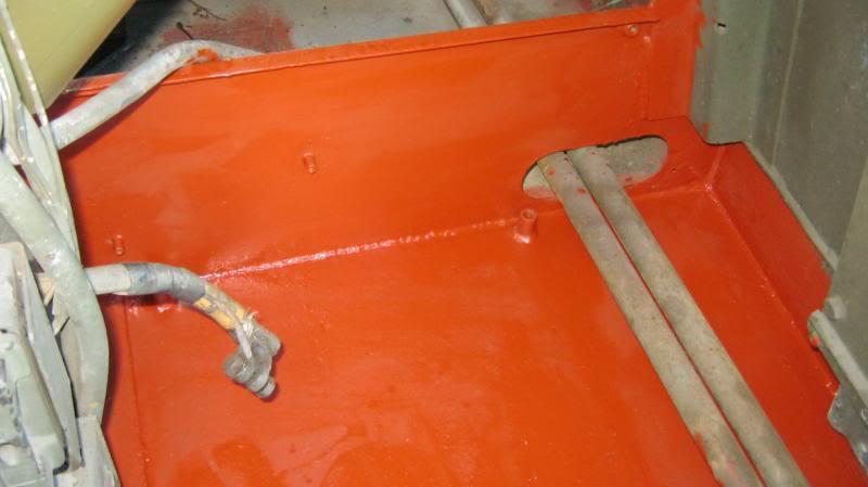 This spot had much loose rust and paint and got the red oxide treatment( been needle gunned again), it is high in the rear of the cabin, I may one day fit the inner com boxes here, it is great little place to keep small items in the cabin because of the metal pocketed area.