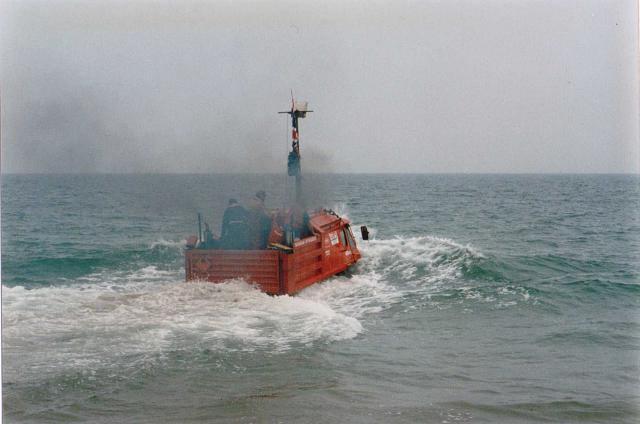 It is not amphibious, but is a close relation of the stalwart and would be water tight up to the top of the wheels.
