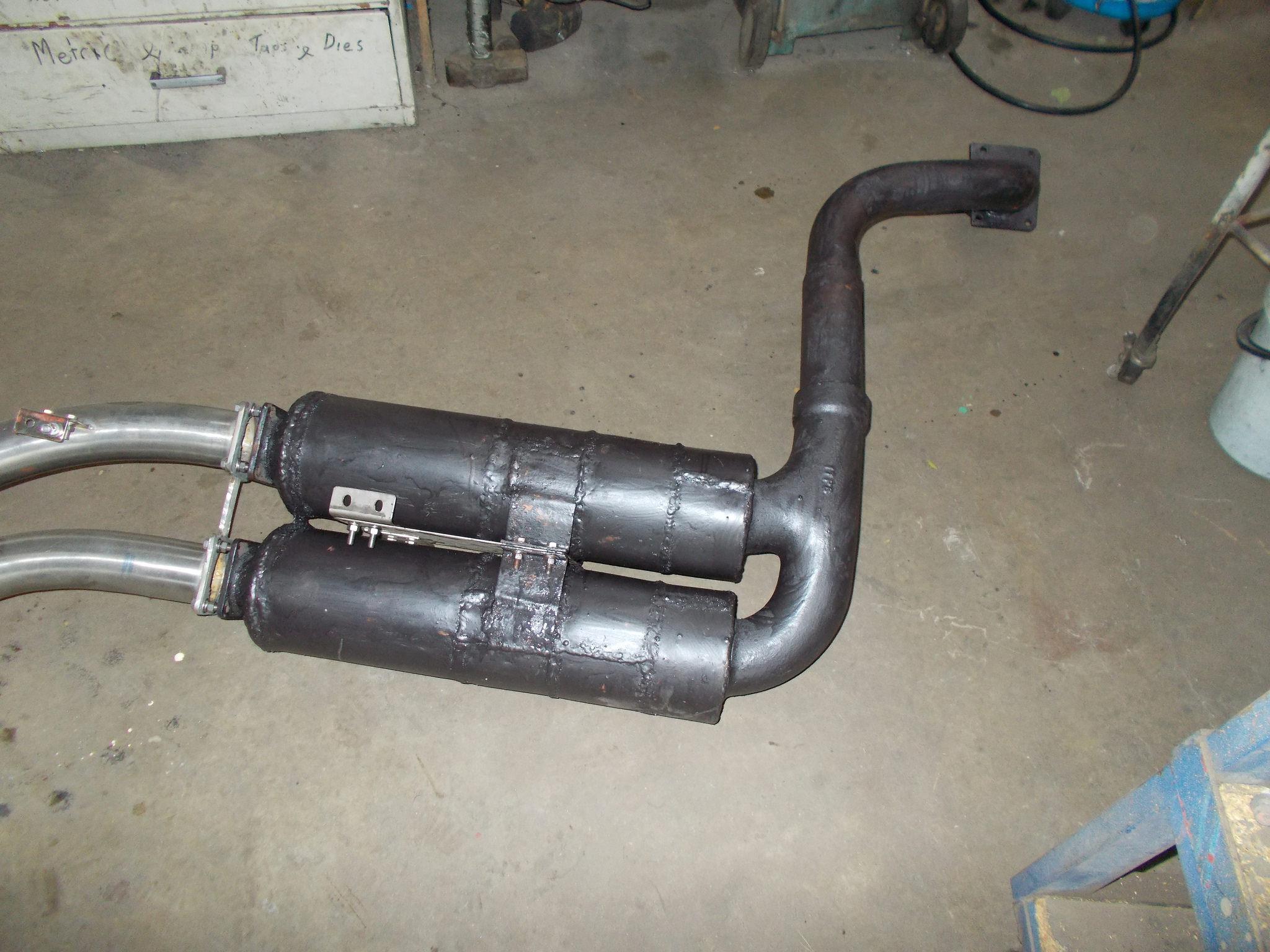 The local Barbeque/wood fire heater place provided very high temp paint for the exhaust system and the mufflers will be wrapped with insulation for a wood fire chimney to stop the paint burning of the side of the outer muffler box.
