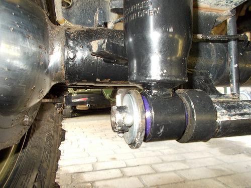 I looked at the AJ bushes and decided to place them against a grinding wheel and reduce the OD to suit the new shocks and gives some sort of preload adjustability and twisting up of the axle under flex with less binding.