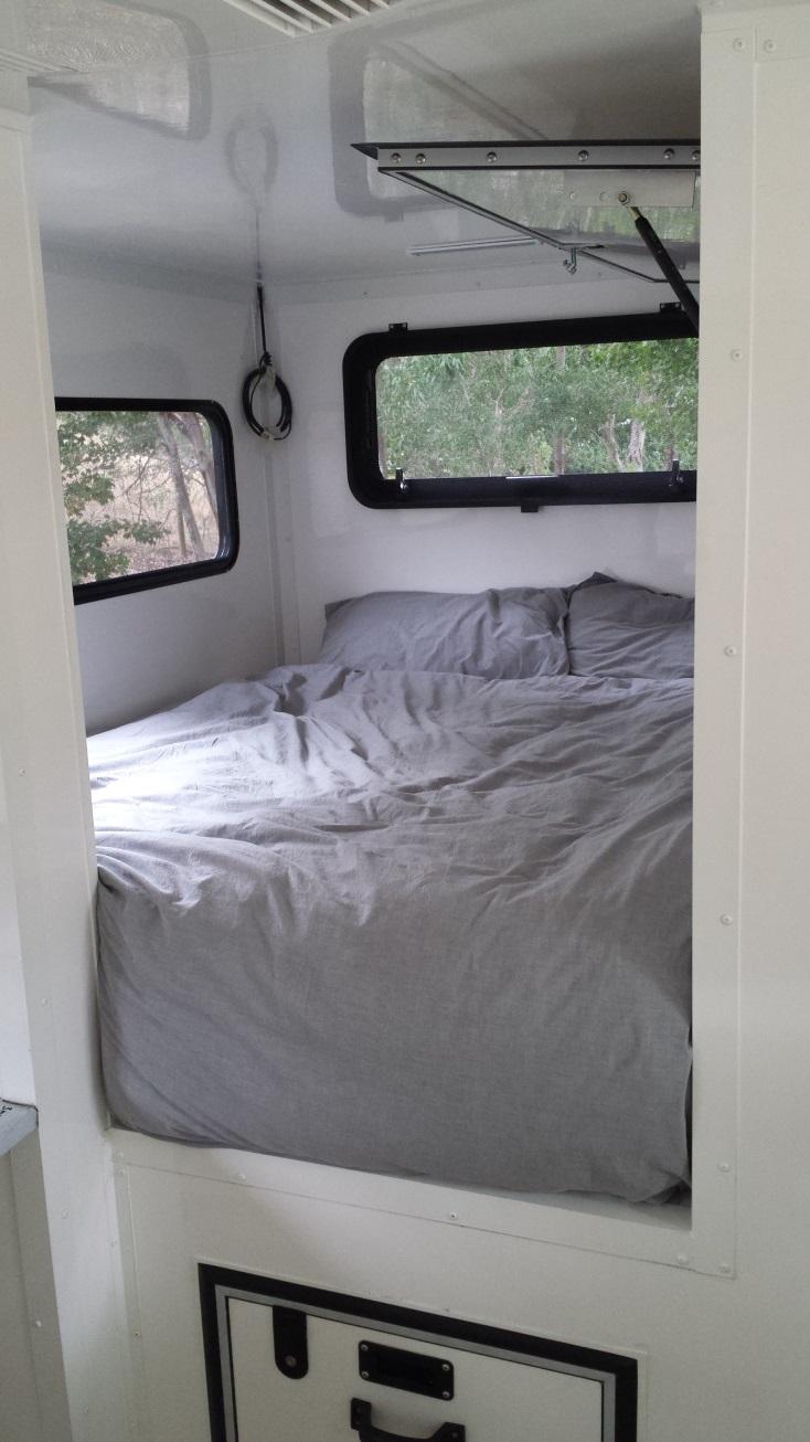 The bed sits on a neat ventilation system called Froli, which is normally used on yachts to stop the bottom of the mattress from going moldy. Got the bed all installed and tested it out for a night, even though it was just in the front yard!