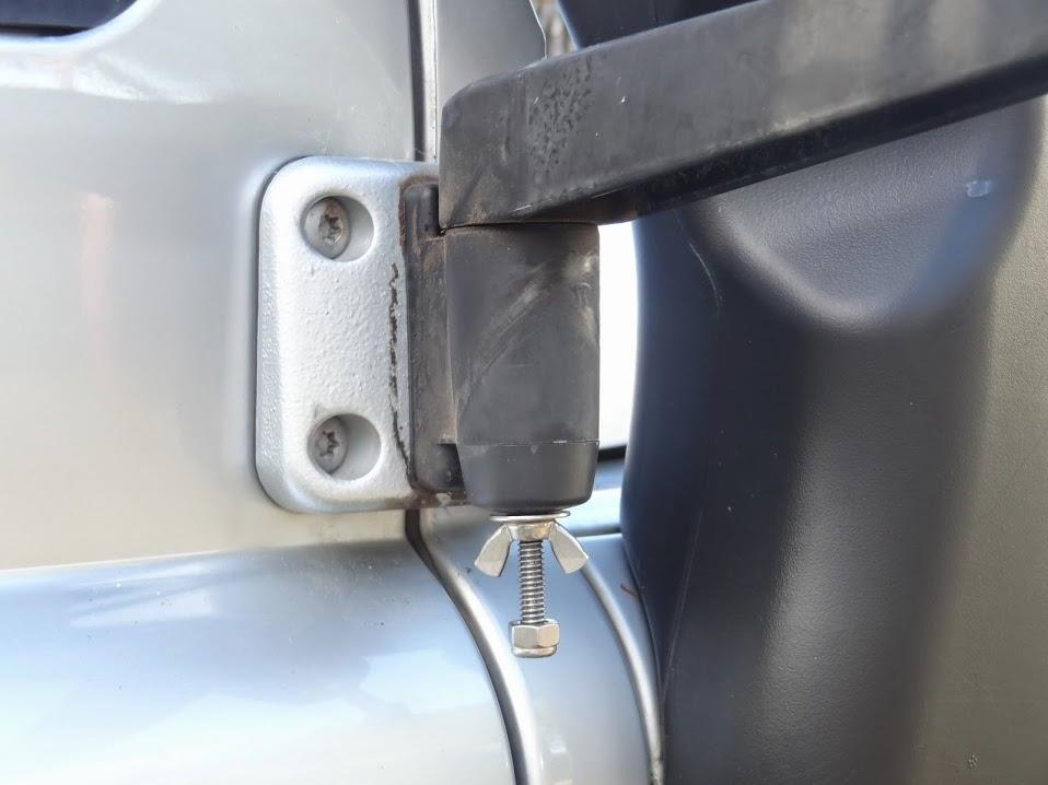 Drill a hole in the bottom cover and put a bolt, nylock and a wing nut and a washer into the hinge assembly as below.
