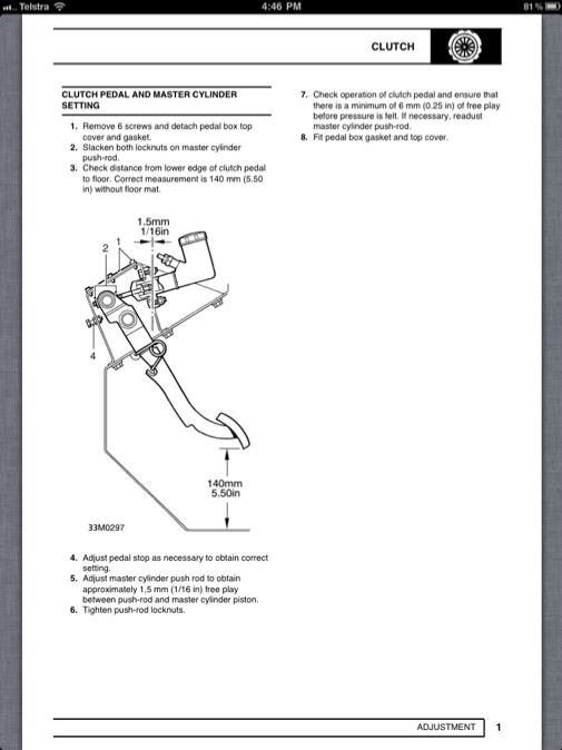 I found that my master cylinder rod adjustment was incorrect, so that the clutch was taking up too high. This was adjusted, and I now have about 6 mm of free play at the pedal, but the pedal is now a little bit lower than the brake pedal. I would like to get it closer to spec if I can. The clutch itself has always worked perfectly apart from this, but the pedal free play has always been too small after a master cylinder change.