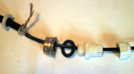 The "grommet" in question is actually a compression type fitting called a gland seal. It will have a flange and flat seal on the insde with a male thread then another flat seal on the outside with a nut, these can have a smear of sealant (SIKA marine sealant, not silicone based). This holds the sleeve in place. Then you pass your unfinished wire through and slide the seal (which will be tapered) down into the (also tapered) end of the sleeve and then fit the outer nut. As it's done up it pushes the seal into the taper (which can have a smear of the same sealant) and seals against the sleeve and cable. Work very well, especially if you just start it and then with a syringe and needle squirt some sealant in between the cable and seal.