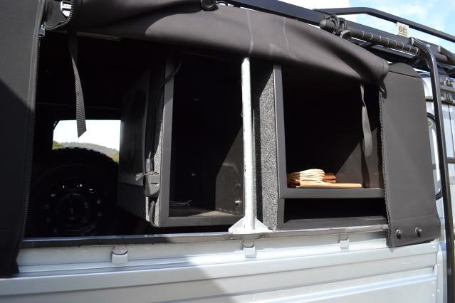 There's a storage cavity forward of the fridge that was accessed by lifting a "trapdoor" on the top surface. We used this for longer term storage items like spares, empty jerries, dive gear etc. The "wings" on each side to the rear of the spare tyres could be lifted to access more storage space at the sides. Under the one on the left was the auxiliary battery. The top surface was carpeted with timber edges and straps that limited the movement of stuff staked in the back while driving.