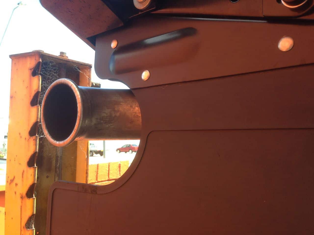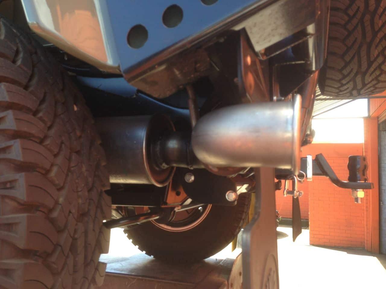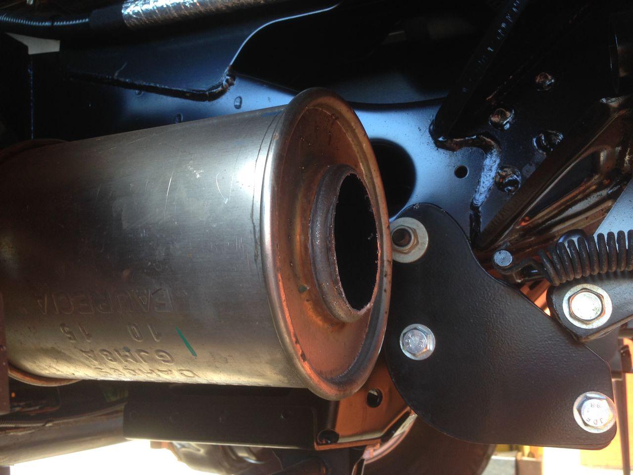 3: Re-weld it on. The exhaust exit is now past the rear of the mudflap and the hot gasses no longer blow onto that.