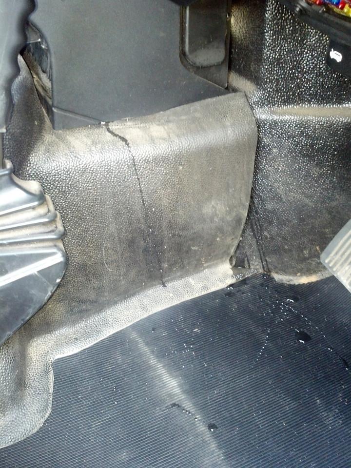 Problem: Even after a ten minute drive with a/c on there is a nice incontinent stream coming from the a/c into the footwells. Today I cut out out the drivers pathetic rubber flooring and found it nice and damp beneath.(A/C water drains out the door when on a decent slope like we were down Yawal last w/e... ) Now I have a nice couple of layers of rubber that I can drag away and clean up the mess left by the a/c...