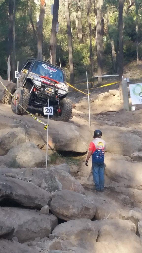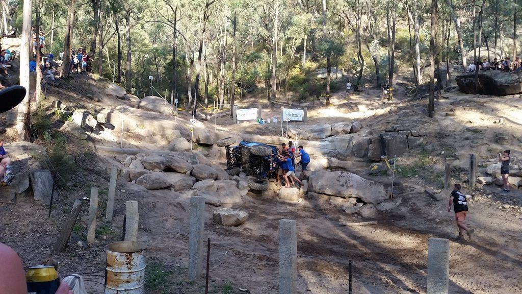 This little zook (Vitara) had a bit of a bad run down the drop off on the Rocky horror course. He ended up clipping his LHS front wheel on the rock, and momentum did the rest. Driver was unhurt. All the vehicles need to have racing harnesses, extinguishers and rollover protection.