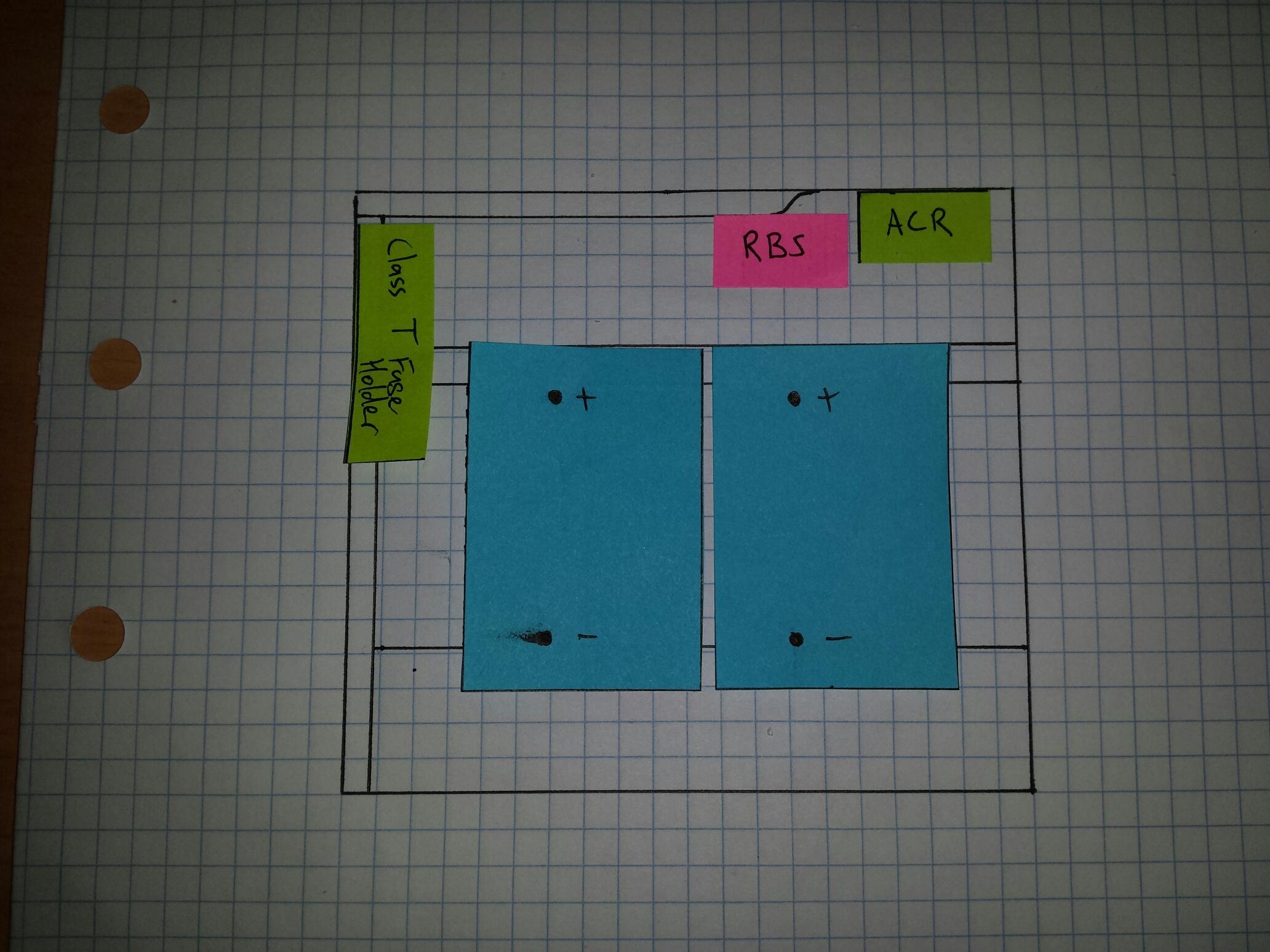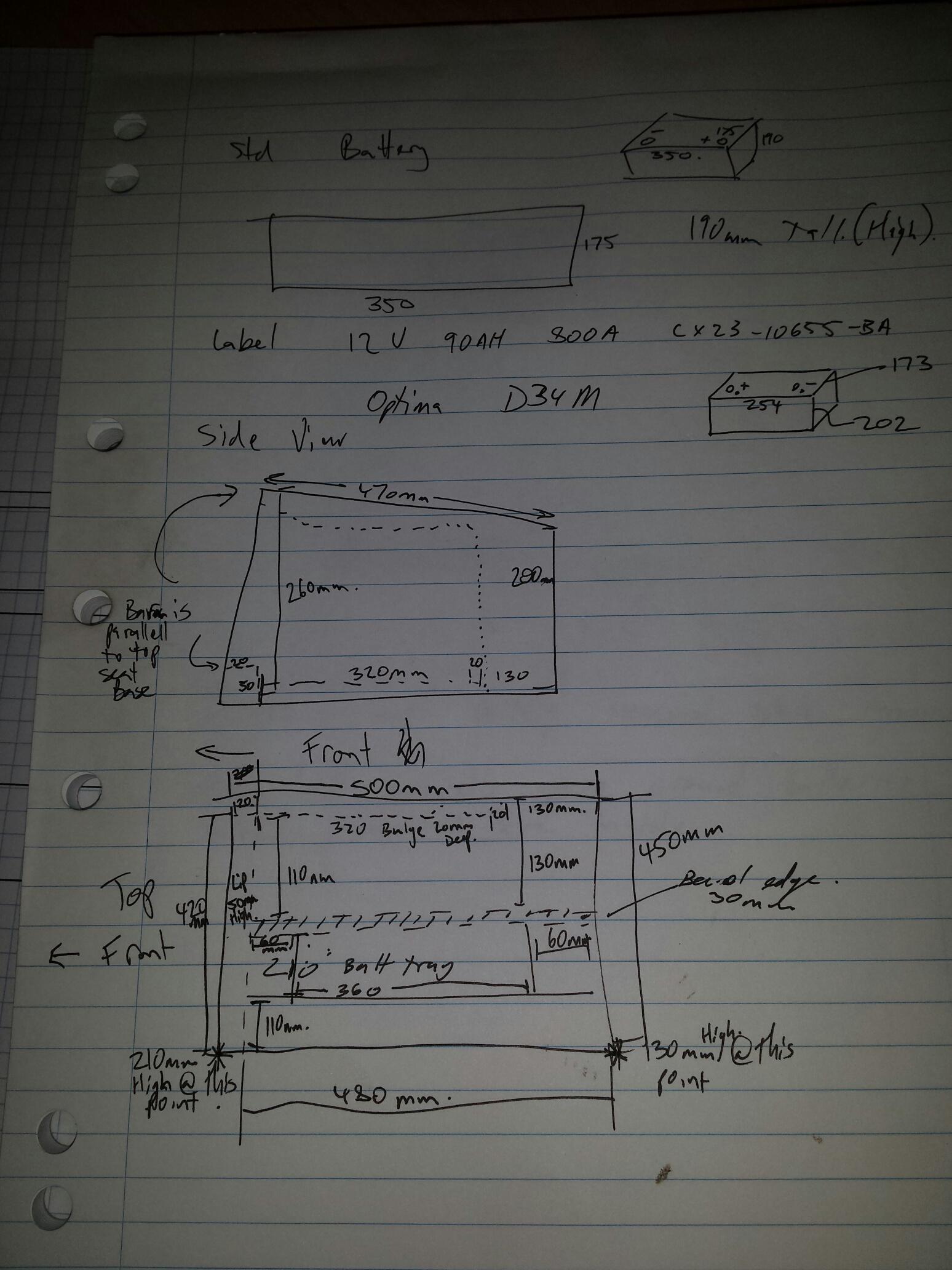 I'm hoping to fit 2x group 34 size batteries in the battery box, along with a class T fuse holder for the winch, a Remote Battery Switch, and an Automatic Charging Relay. It's going to be a tight fit, so I spent some time with the tape measure and a notepad, and got to work. I'm no Picasso, but it made sense to me at the time.