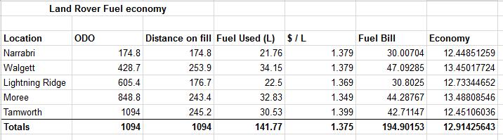 Fuel usage was highest on those legs of the journey where the speed limit was 110km/h, or high speed dirt road driving - lots of slowing down for animals, bends and cattle grids, often from 100km/h in 5th / 6th gear down to 80 or so.