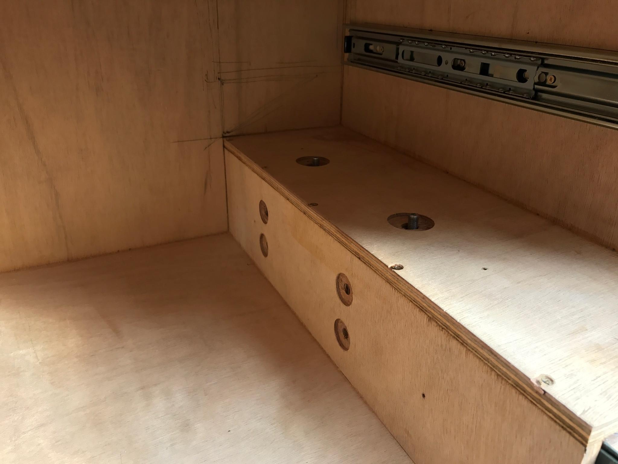 Yeah I know what you mean Chops. I decided to go ahead with the easiest possible solution first. I'm going to add a few more supports under the cutlery part and with the front on it'll be a pretty strong box. Have left a 13mm gap on the side of the main box between the carcass so can install a runner there if needed.