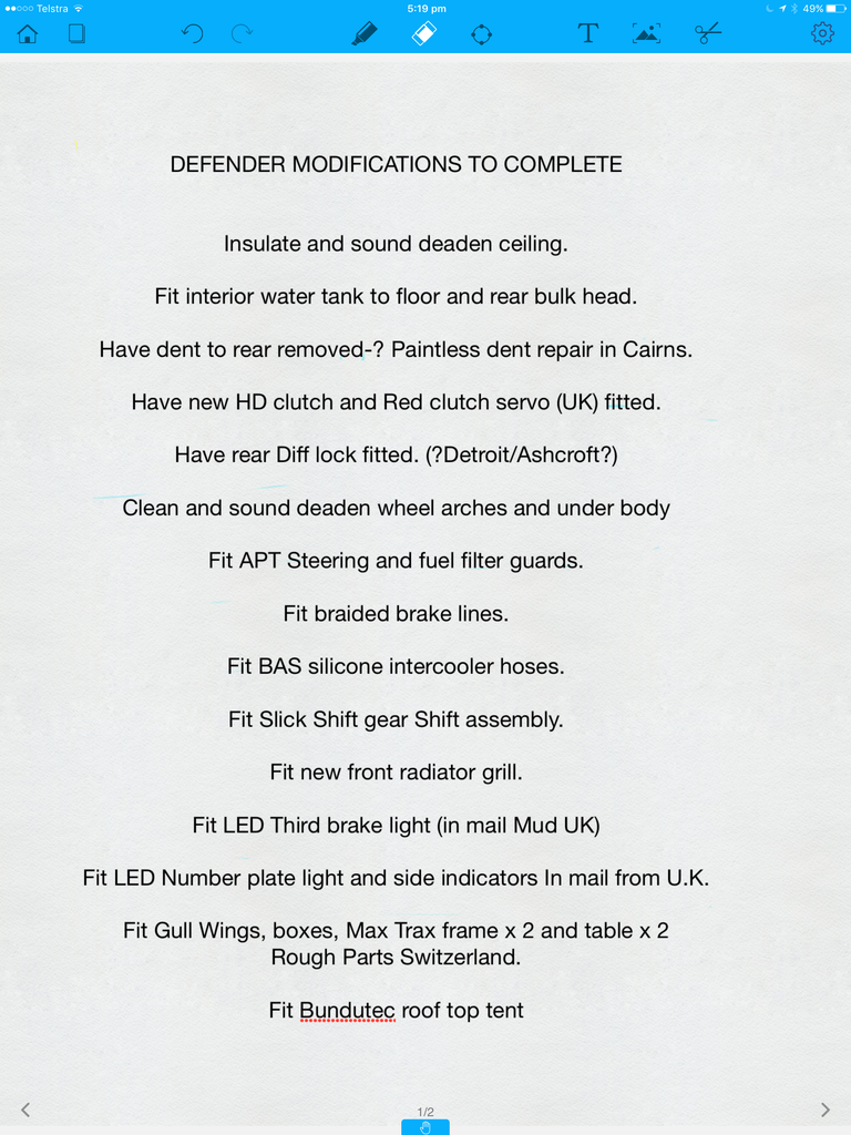 Ken I think your list looks more like my "wish list". My ever growing "to do" list says things like..... Fix leaking p gasket coolant leak, replace stuffed rear a frame bushes, fix transfer case oil leak...... Definitely a case of wants and needs for me.