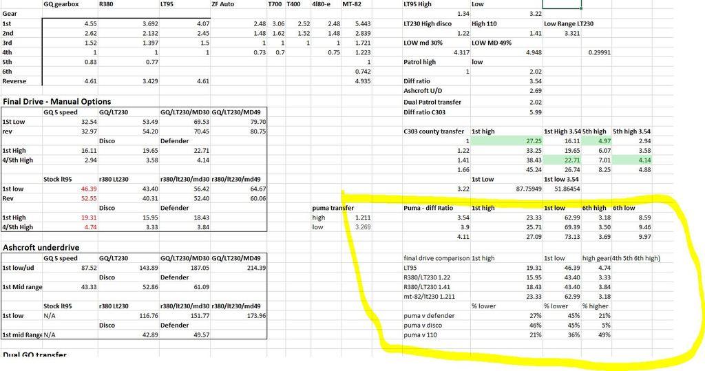For example a puma vs TD5 defender is roughly 27% lower geared in high range 1st and 45% lower geared in low range low, if my numbers are correct. 6th gear high on the other hand is roughly 21% higher.