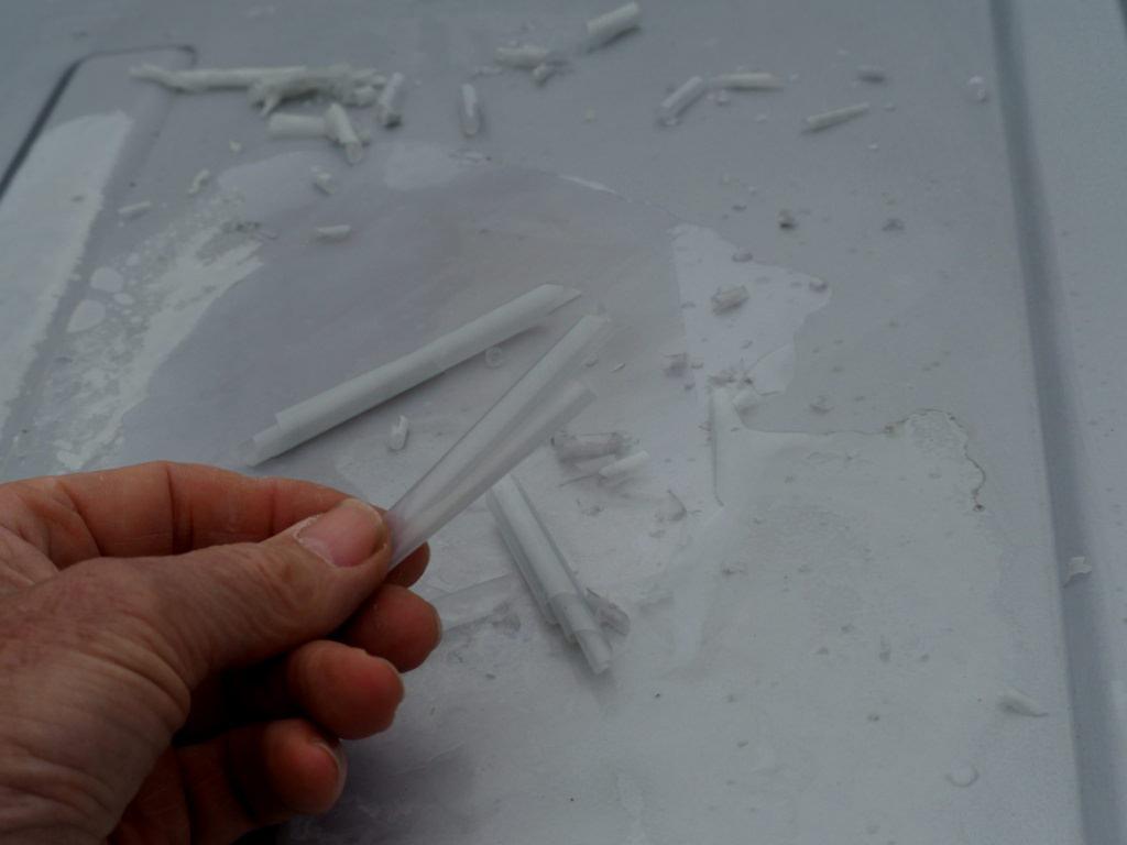 It was dry, and a bubble of what looks like clear-coat or similar that has decided to part company with the underlying paint.