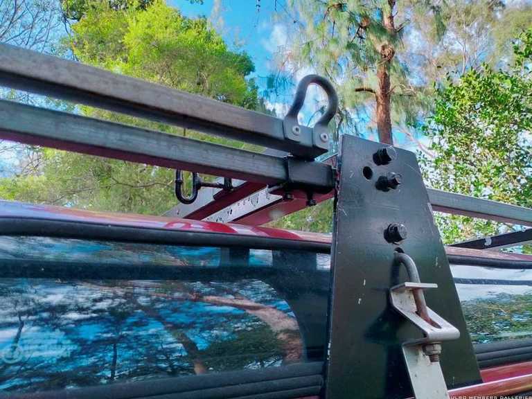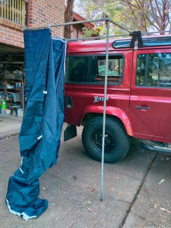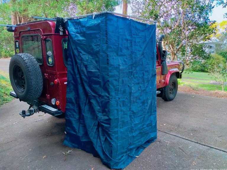 This is my homemade shower cubicle. Frame slides in under roof rack, curtain is just a wall section from a 3 x 3 gasebo that simply velcros onto frame. Can use poles if windy but not required for support.