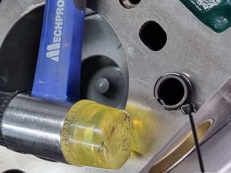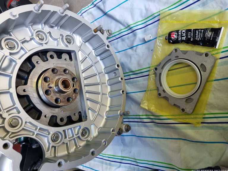 At this point, careful as I was, I almost derailed everything. Following the instructions, I applied RTV sealant to the rear face of the aluminium seal surround, and installed two guide studs. Keeping the inner slip guide in place to ensure the teflon seal was not damaged as it slid onto the running face, I slide it into position - only to discover that I had contaminated the crank with silicon on the way through.