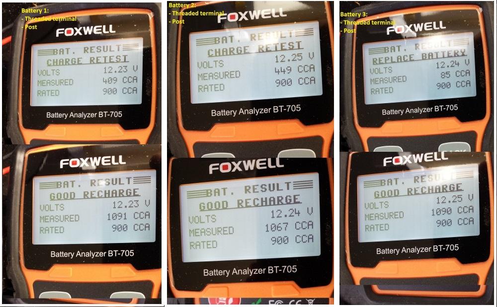 So, I went out and bought a Battery Analyser to see what readings I'd get, and the results are striking. Top row of photos is the threaded post reading. Bottom row is the round automotive posts. All readings taken within 30 seconds of each other: