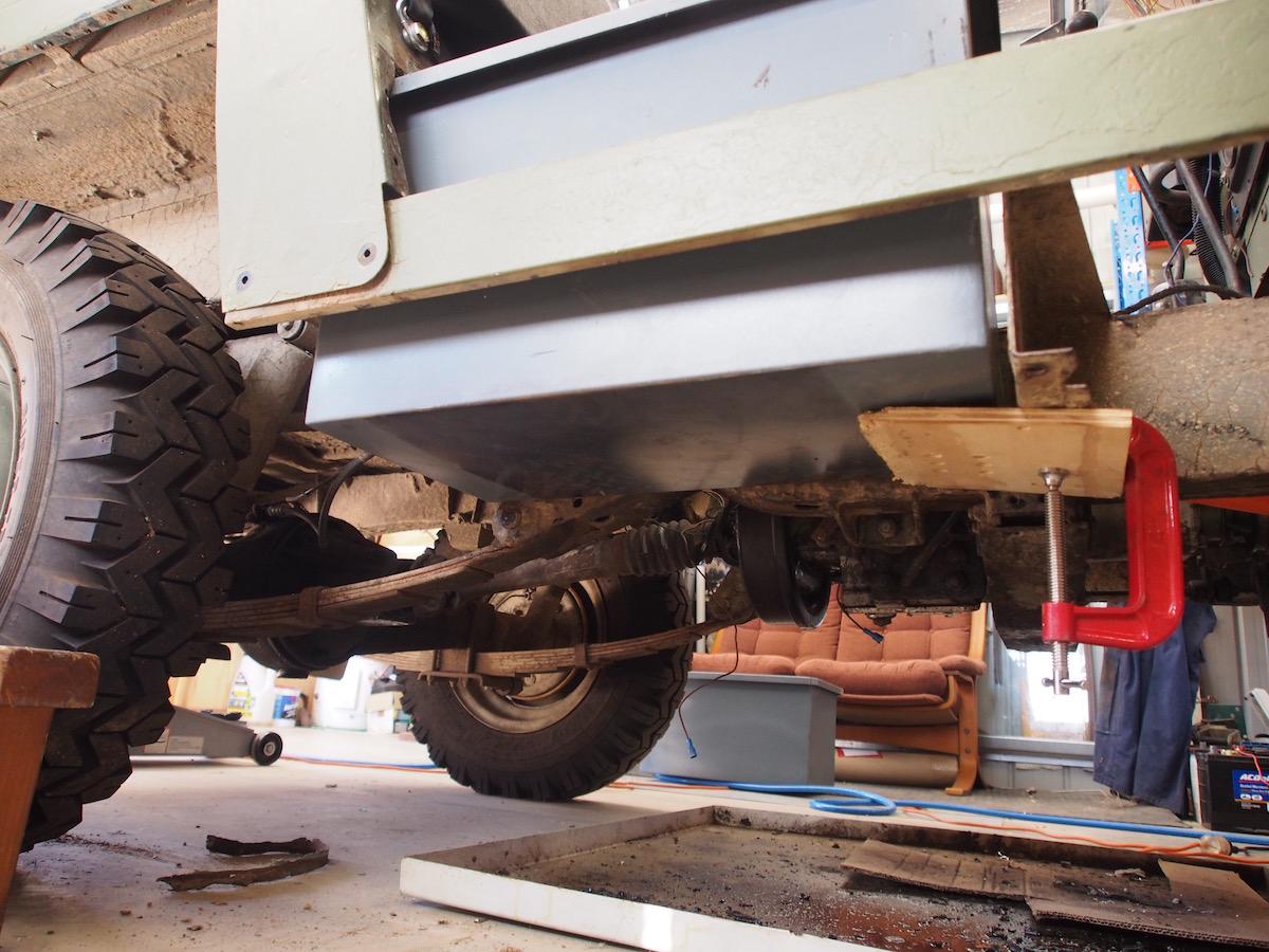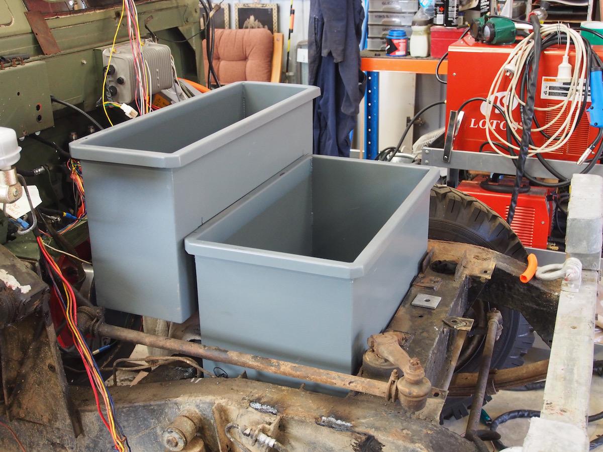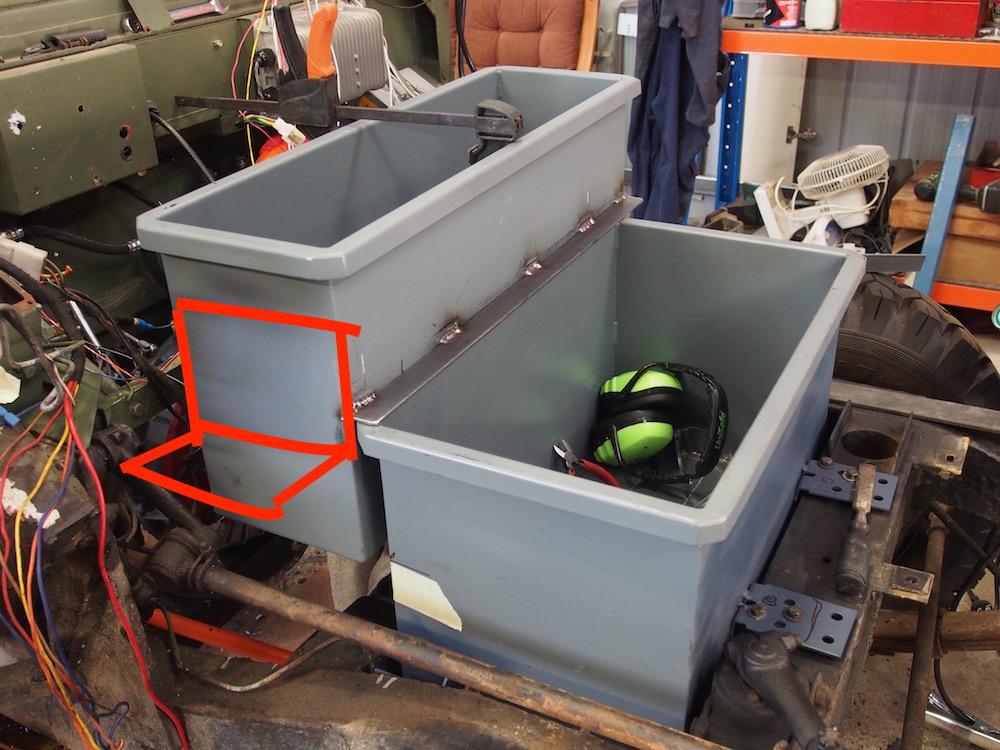 All boxes are 320mm high to accomodate 280mm high cells plus room for wiring & clamps. Front box containing 12 cells, sits below the top of the chassis to lower center of gravity, but not so low that the diff will touch it .
