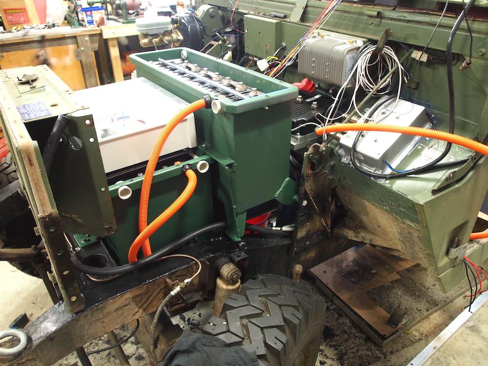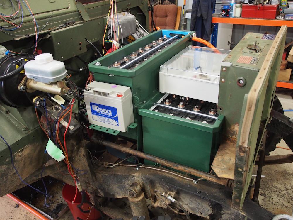 Mounting of rear box is a problem, I have to mount it high to clear the motor & offset to one side because of steering box arm , This gives me a place to mount my 40Ah 12Volt Ancillary battery ( Golf Buggy battery) .