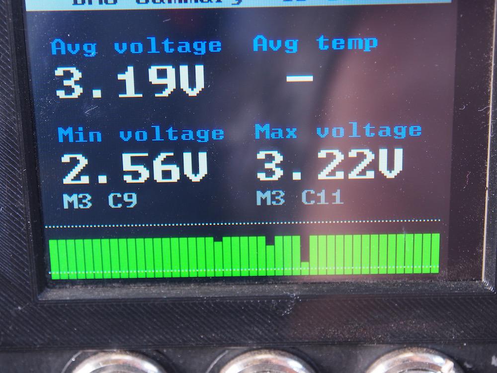 Here is the BMS window, you can see the bad cell represented by the short stick !! Flat is 2.4 which it got to, bat had recovered some by the time I took the photo. I charge them to 3.45 so most of the other cells look pretty good.