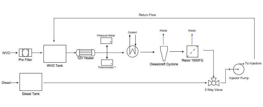 Ok, so below is my diagram of my proposed setup. I'd like for this system (mobile) to run straight WVO. Any comments, thoughts and opinions would be greatly appreciated.