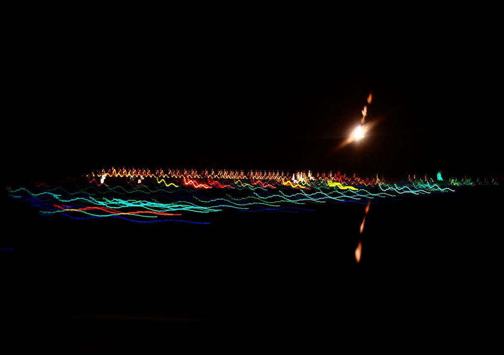 The runway lights of Bangkok Airport. Taken through the window of the aircraft as it was taxiing, the stationary light is the light on the wingtip.