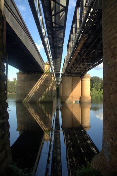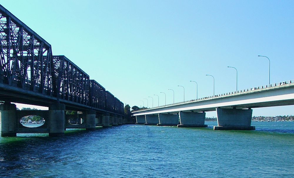 Bridges over the Nepean River, Penrith, NSW. Victoria Bridge (road) on the left, railway on the right. Gas/water in the middle.