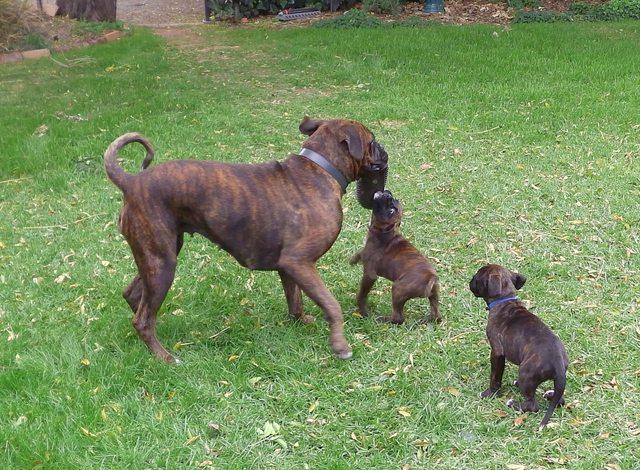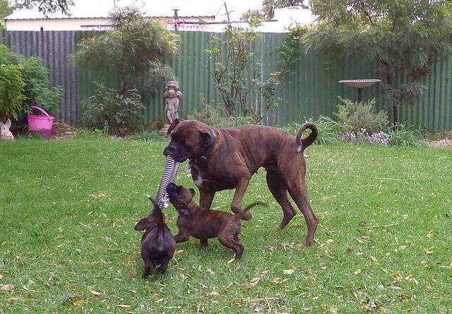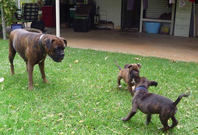 Next door's Boxer has recently had pups. She had a litter of 7, but unfortunately only two have survived. They are going to keep one (the female which is the lighter coloured of the two) and the male pup is going to the owner of the father of the litter.