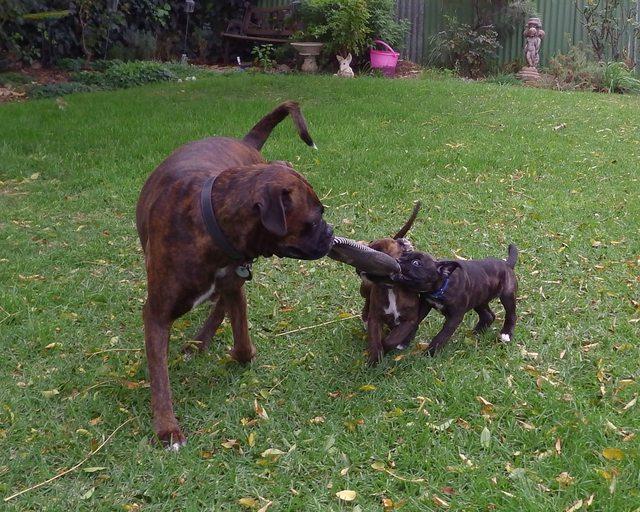 When I was pulling weeds / tree roots etc out and throwing them out into the garden area, the pups thought it was great fun to grab it all and try to put it back where it had come from.