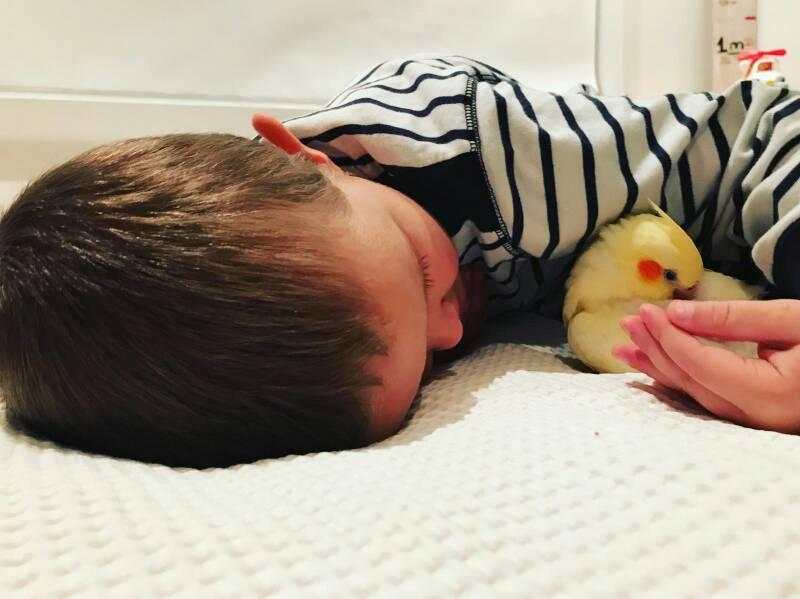 A grandson and his bird.