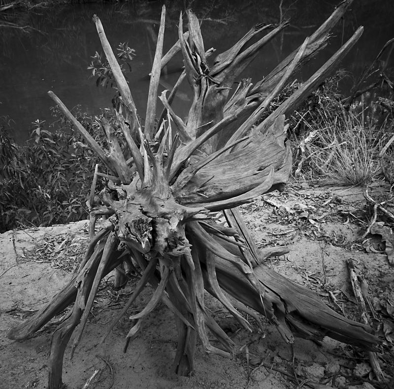 These are two images of a dead bristolcone pine tree in The White Mountains east of Bishop CA. I took the images this summer on a short 4 wheeling vacation. There are two groves of living ancient trees up on the mountain.... they are at about 11,000 feet in elevation. (the highest peak about 8 miles, away is 14,200' )- The living trees are the oldest living entities on earth - one of the living trees date back 4,000 years. This dead tree and other like it don't rot away very fast - first the wood is extreamly dense, but more importantly the air is so thin and dry the dead wood does not rot. They get snow up on the mountain but when it melts, it immediately evaoprates. It is a very harse enviroment and tough to stay hydrated when doing any physical activity. When I was younger I mountainbiked from this location to the peak.... it was a very tough ride. Some of these ghost trees have been determined to be 5 to 8 thousand years old.... depending on the light they always make a good piture!