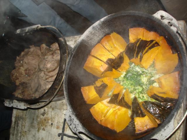 i started with a jap pumpkin, cut the top out and removed the seeds, into the camp oven (first mistake i didn't put any liquid in the camp oven) after checking a couple of time the pumpkin was not cooking quick enough, after about 25 minutes i grabbed meg's glass of wine and poured it in along with some water, i also added the broccoli and white sauce and popped the lid ona sit was looking like it was not going to be cooked on time.........don't ask how much longer it cooked for but it turned out perfect. with the left over pumpkin i whipped up some more scones for morning tea on the sunday