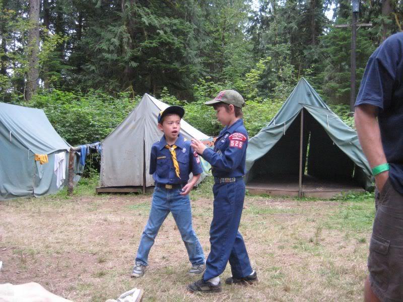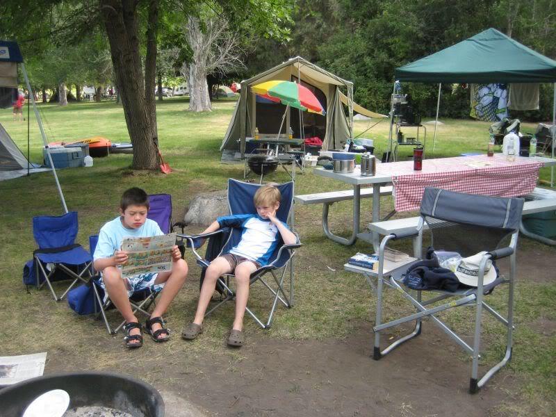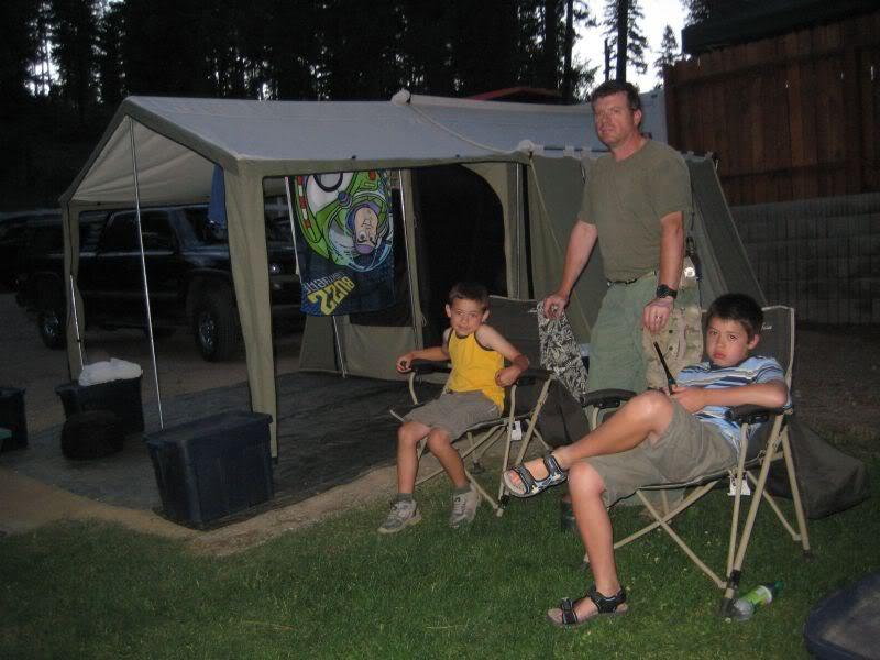 They put those tents up at the start of summer and leave them up until fall. They've seen better days, but stayed dry when it rained. In fact, all the water came right down the tent side and onto the wooden platform after the boys were screwing around and lifted the bottom of the canvas up onto the platform! It's okay, 'cause I was in my cot and stayed dry.![]()