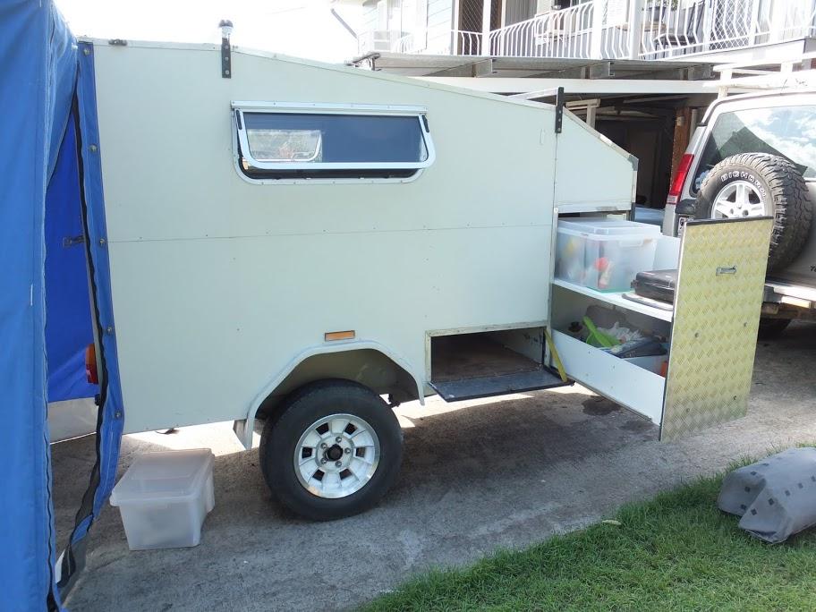 Here's what we have sort of ended up with. Been out a few times with this now, including 10 nights over to Melrose and back, and it is working well. Can set the whole thing up in 45 minutes including the awning, and about half an hour to pack up. If we are only staying somewhere one night, then we don't use the awning, and cook from the tailgate of the Rangie.