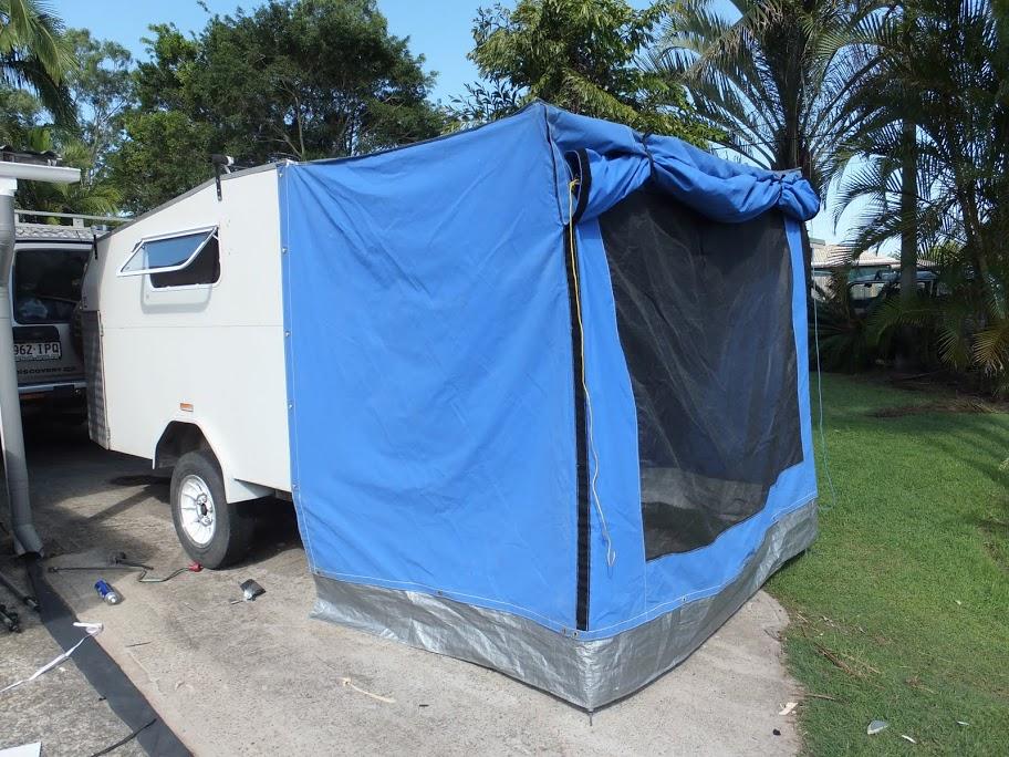 Its nice to have options though and below is my "intermediate" option, using the off road trailer, tarps and poles. My "basic" option is a tarp off the vehicle and swag on the ground (Pics are earlier in this thread).