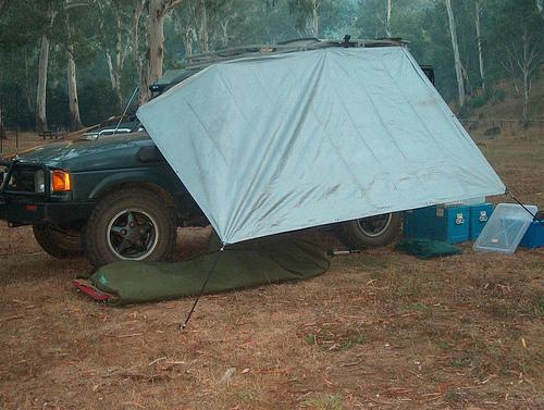 I'll be rigging the tarp up awning style, off the side of the car. Like this (hope you don't mind me stealing your pic, sschmez!)