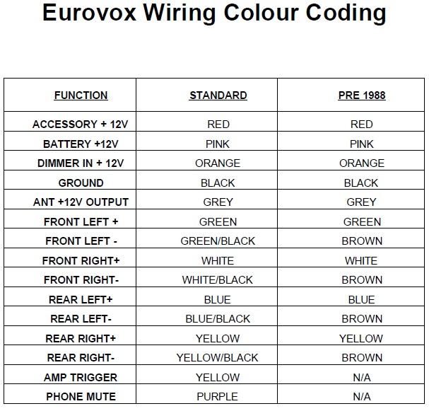 This colour coding was completely accurate for the factory headunit I removed, may help some.